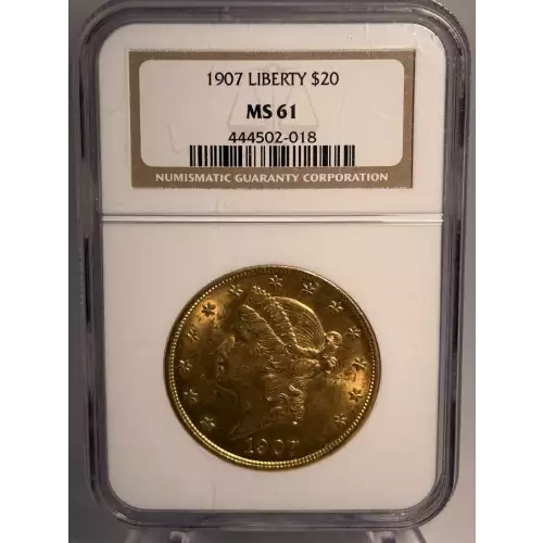 The 1907 Double Eagle is notable for being one of the last years the Liberty Head design was used, before being replaced by the Saint Gaudens design in 1907. This particular coin is sought after by collectors for its historical significance and gold content. The MS-61 grade indicates that while the coin is in good condition, it is not perfect, offering collectors a more affordable option compared to higher-grade examples.